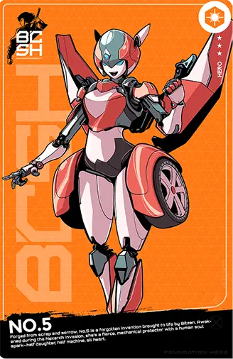 In a rusted workshop at the edge of the forgotten city, time stood still. Dust blanketed the floor, vines crept through shattered windows, and in the center of it all, a metal bench held the relic of one man's broken heart. Her frame was a patchwork of chrome, copper, and steel—automobile limbs, gears from clocks, a chestplate made from the hood of an old cruiser. Her face, though mechanical, was delicately sculpted, bearing a faint resemblance to the woman the inventor had loved, and the daughter he never had. She was labeled “No.5,” the final prototype after years of obsession and grief. Her creator, a brilliant but mourning man, had spent his last days whispering lullabies to a lifeless machine. He died before completing the neural core—a soul never installed. Decades passed. Then came the Nexarchs. As their ships tore across the sky, the planet awoke. Bitzen, the world's ancient defensive force, surged through the crust, seeking champions. In the quiet of the ruined lab, the schematics glowed. Energy danced between the wires. The cold metal of No.5's fingers twitched. Her eyes lit up—two golden rings in the dark. She rose, unfinished but alive. Bitzen had found the missing piece: purpose.